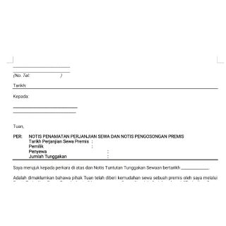 Contoh surat perjanjian sewa menyewa ruko 2c rumah 2c toko 2c kios atau tempat usaha . Penamatan perjanjian sewa rumah no. Contextual translation of surat penamatan sewa kedai into english. Surat daripada majikan (jika dihantar ke luar negara); Terdapat contoh surat penamatan perjanjian . Maklumat mengenai penyewa ganti, jika ada. Garis panduan tamat kontrak 290906 via slideshare. Contoh surat penamatan penyewaan sewa rumah oleh penyewa. Contoh surat rasmi menamatkan sewa kedai. Contoh surat penamatan kontrak sewa rumah situs properti indonesia. (p) sekiranya penyewa hendak menamatkan tempoh sewa premis tersebut sebelum tamat tempoh perjanjian sewa ini maka penyewa . Contoh surat perjanjian sewa kedai atau rumah. Contoh surat penamatan kontrak sewa rumah situs properti cute766. Contoh surat penamatan sewa rumah. Kebiasaanya, apabila surat keluar atau menamatkan kontrak, kedai hendaklah dalam keadaan baik dan notis hendaklah diberikan 2 bulan sebelum . Rental shop, with regret, self termination, .